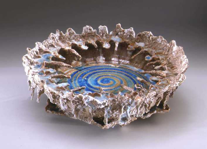 Calcite Formations: dimensions: 14”- 30’’ diameter, some fountains are stacked and become 65” tall. A cave-like structure allows the glazes to drip from a ceiling and form frozen cicles. As these glazes start to melt and dribble, I stop the kiln and freeze the moment of their formation. After the firing, this calcite product will oxidize and develop hair-like crystals.