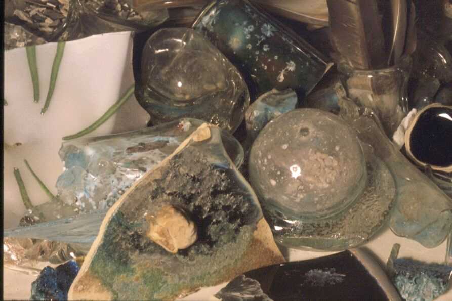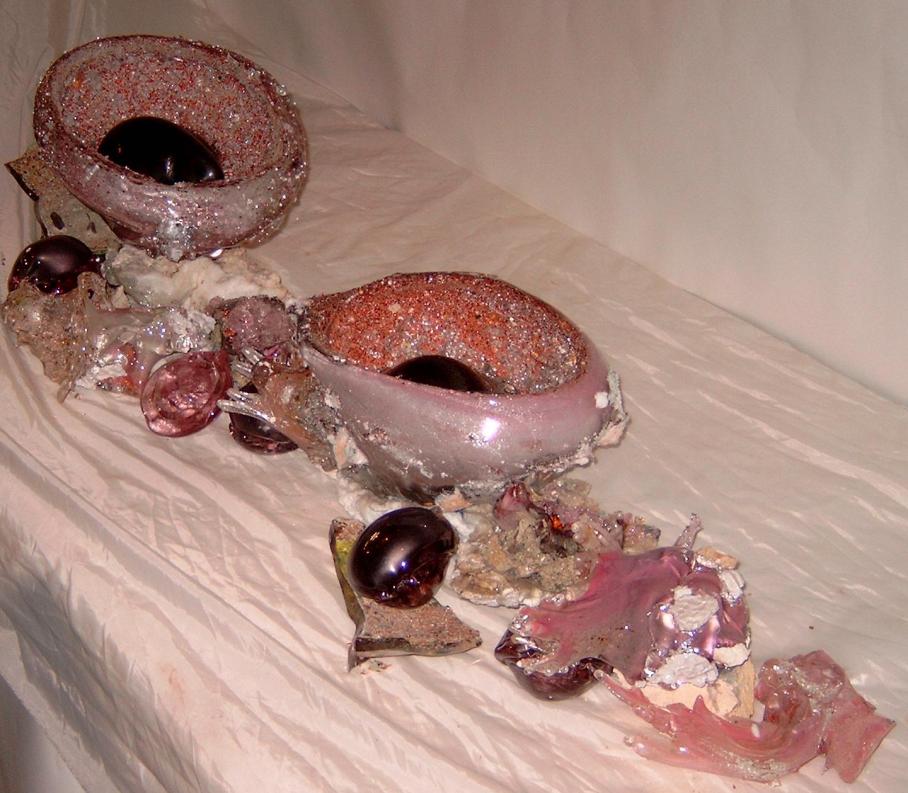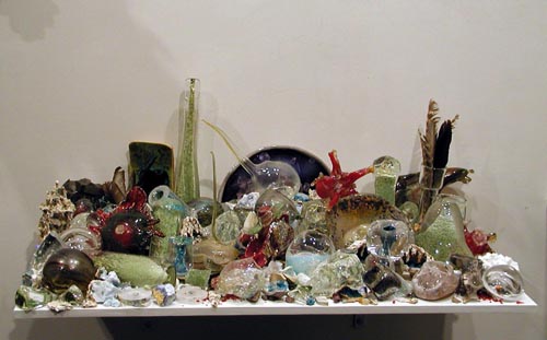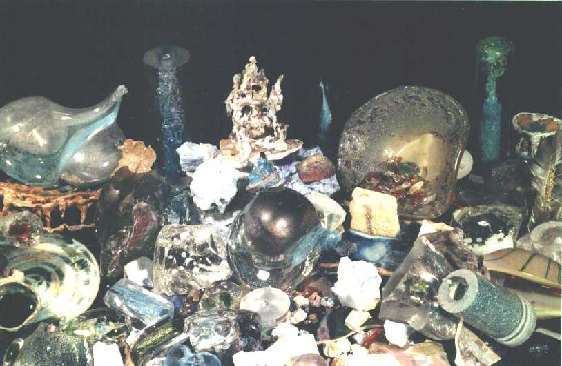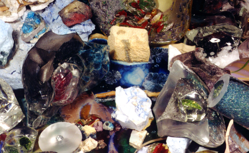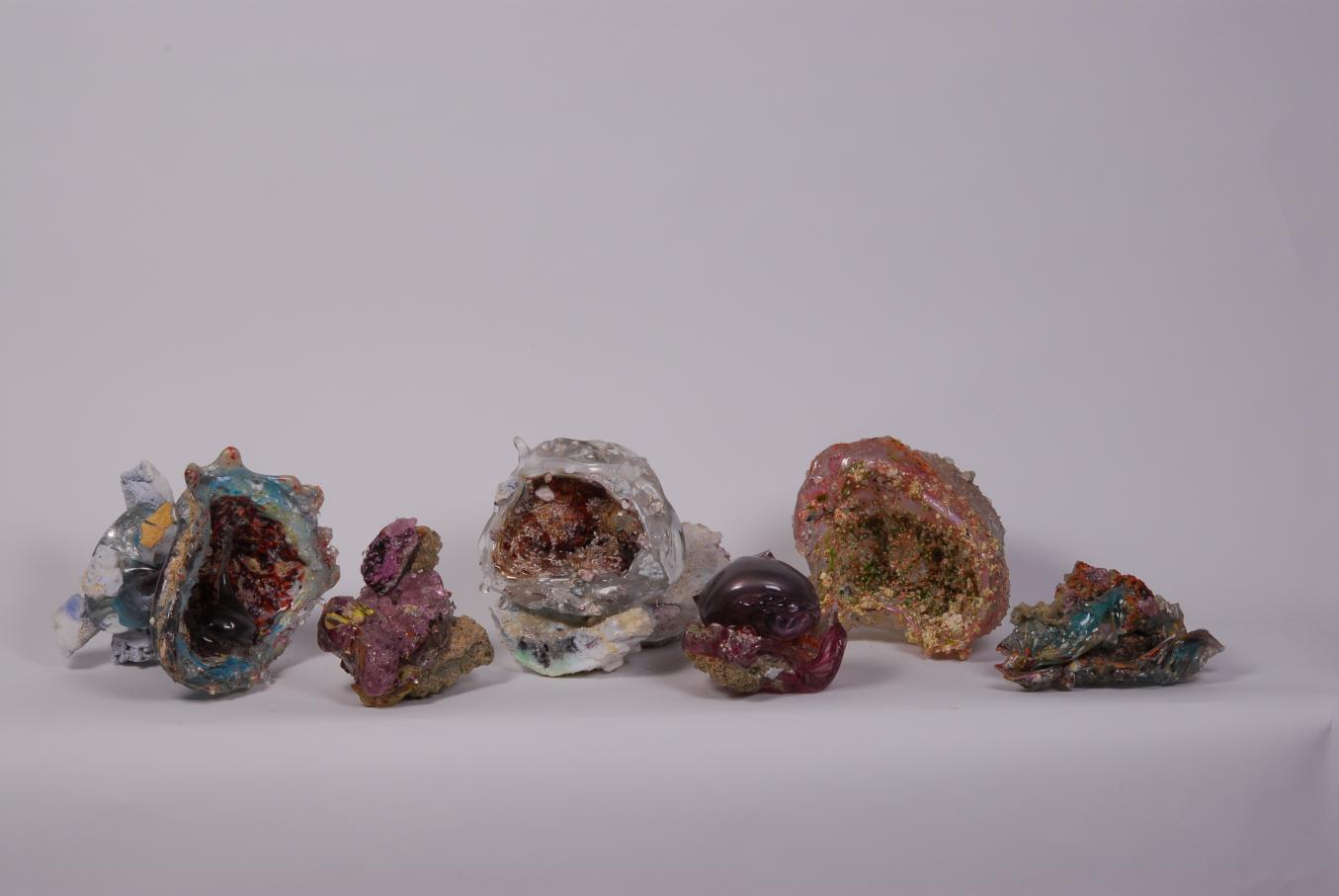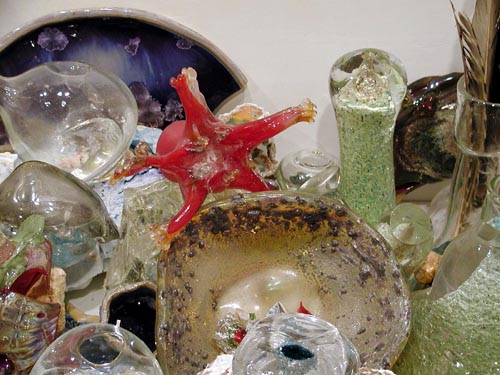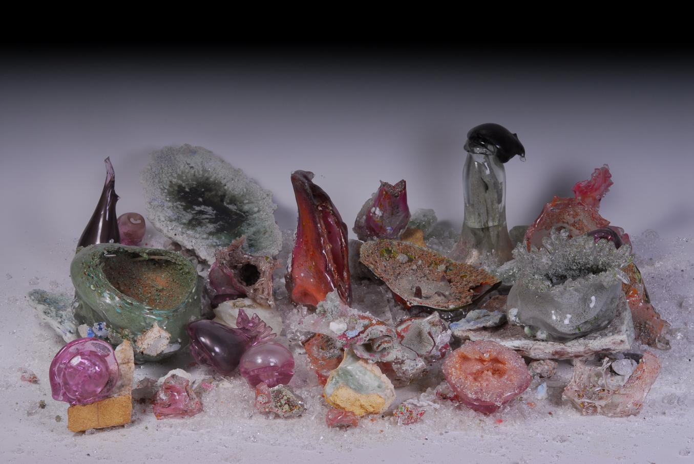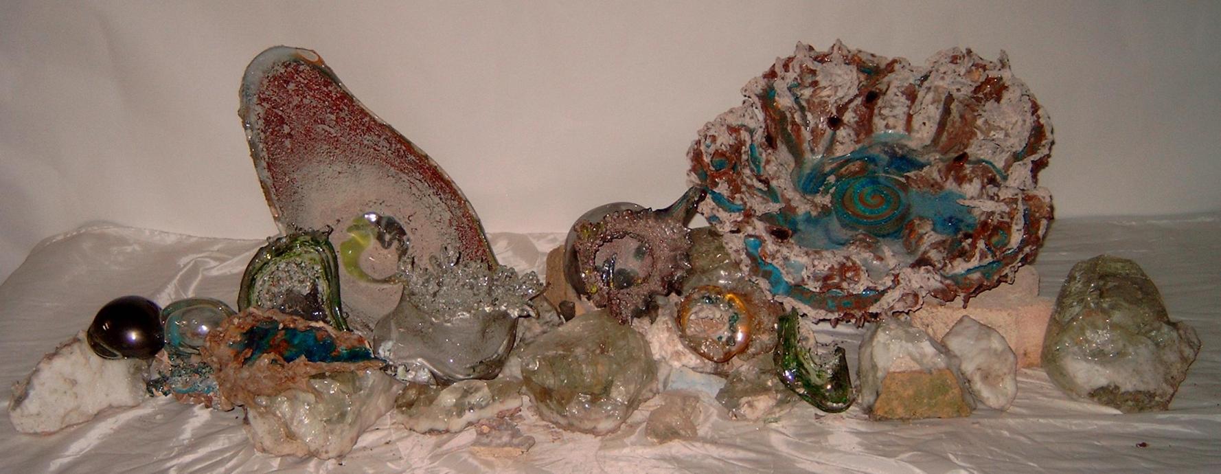 Works incorporate blown glass, ceramic sculptures, glazed kiln bricks, and glory hole floors. I place chemicals into the hot glass and control the melting and cooling of these materials. Spinning and dripping materials encrust the glory hole and kiln floors. I harvest these foundations and nest the vessels in them. Finished works include the environment from which they were born. They are a geological landscape of imaginary planets.