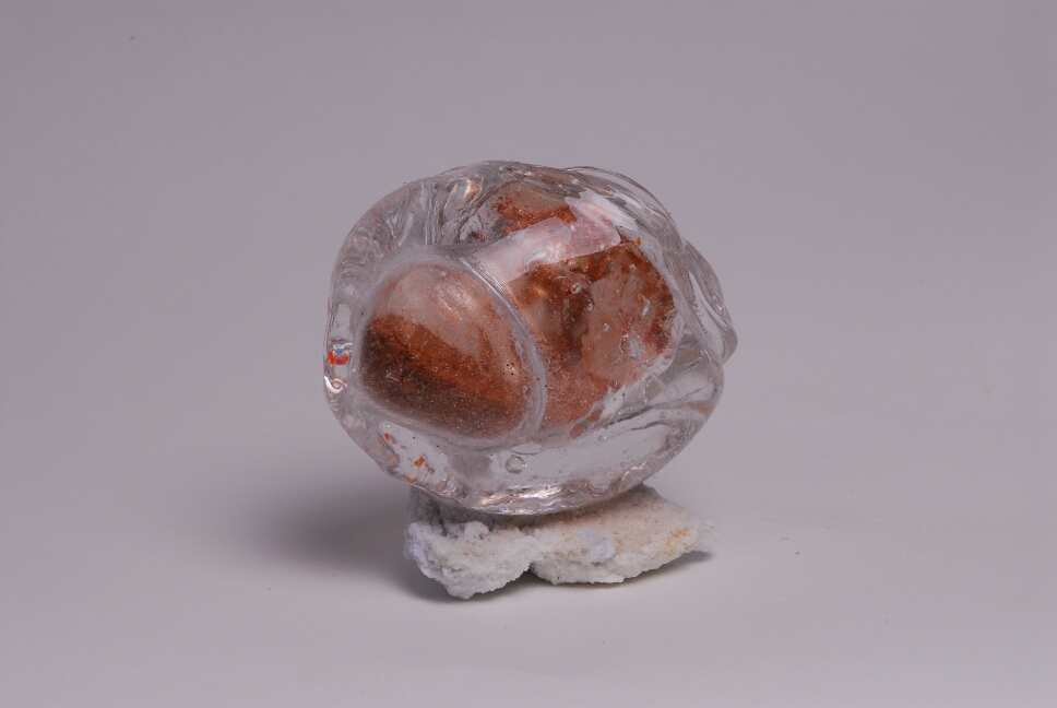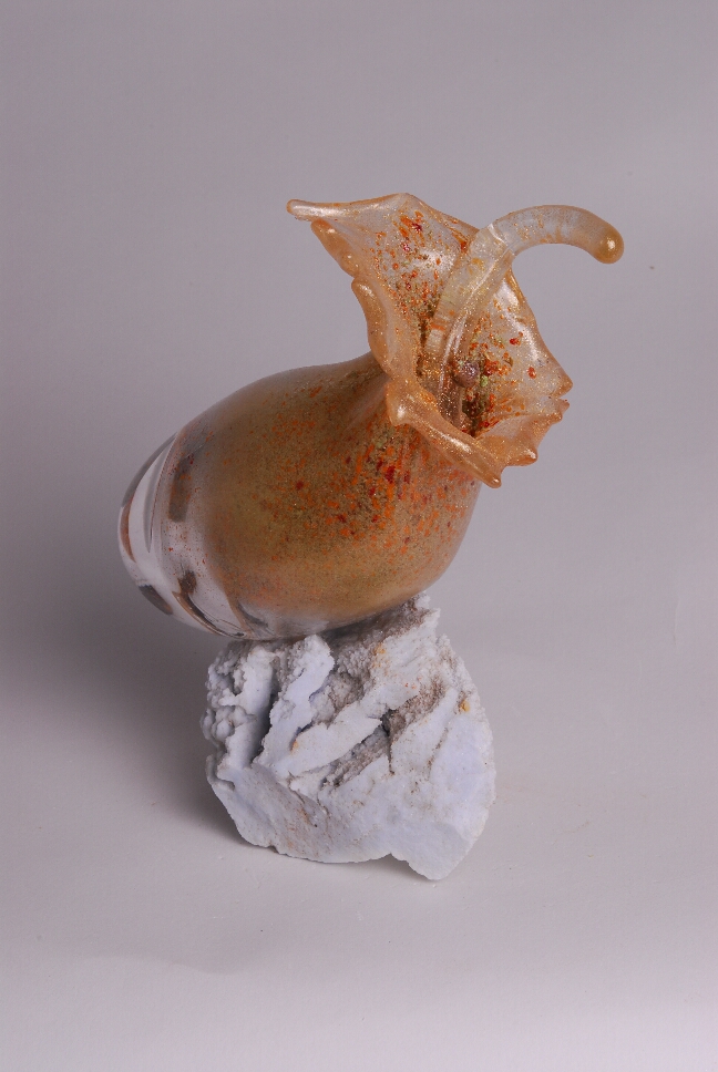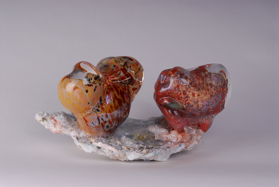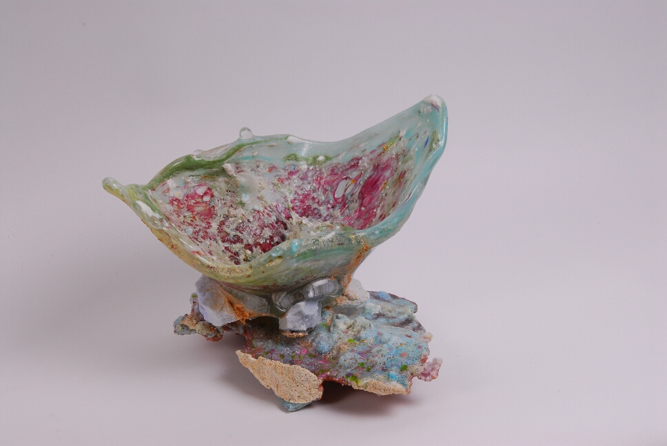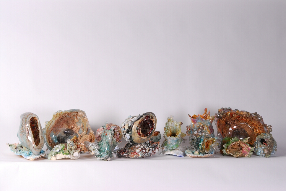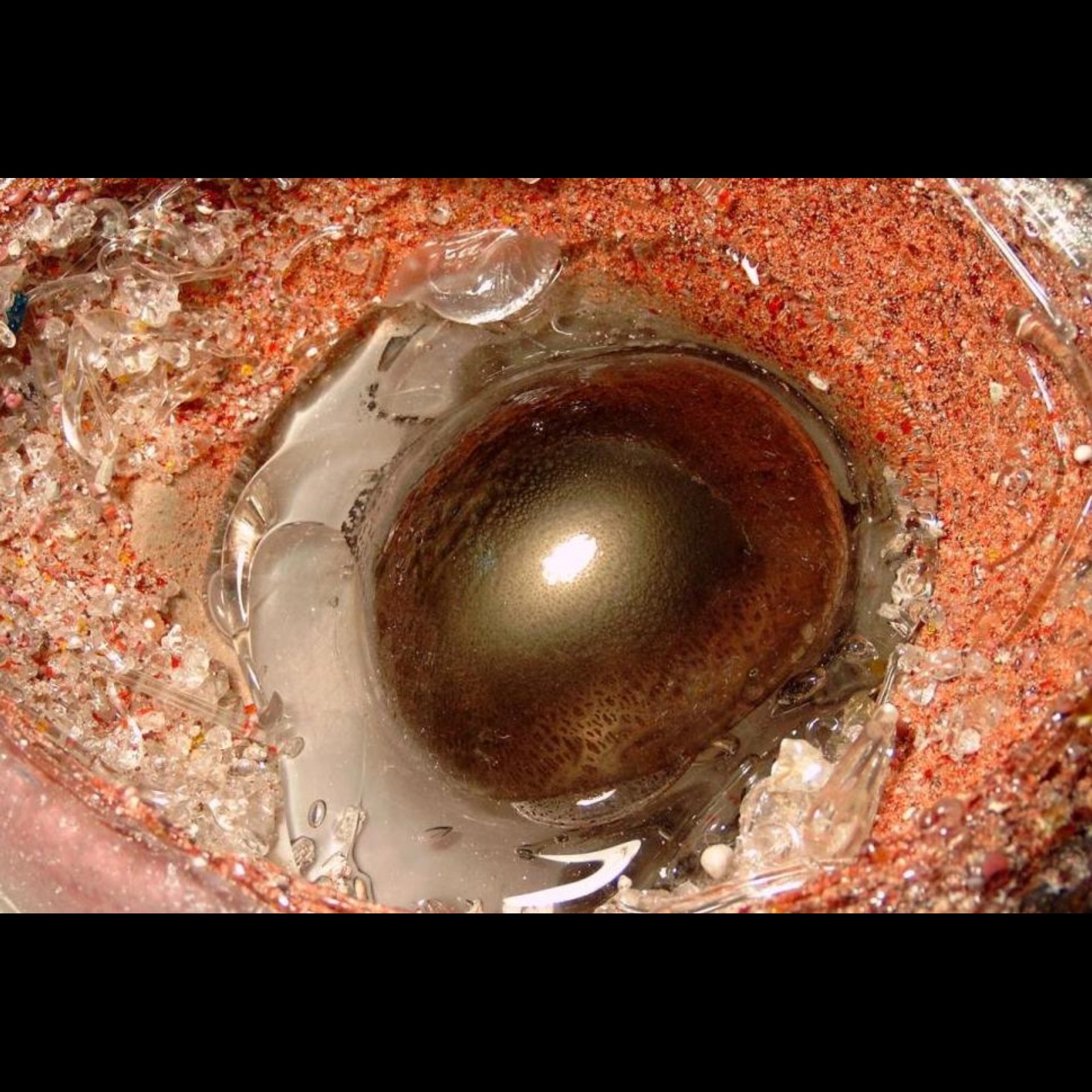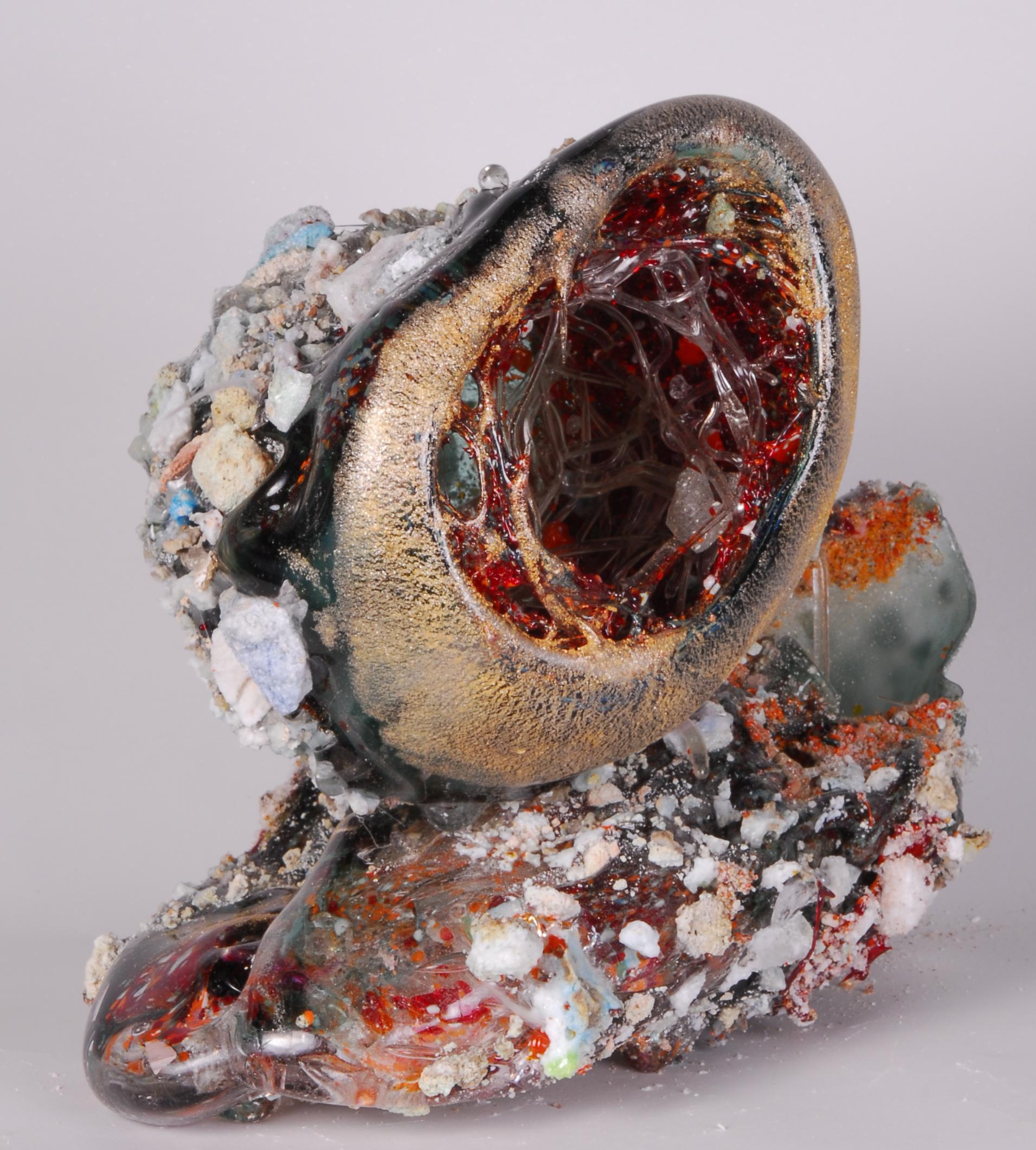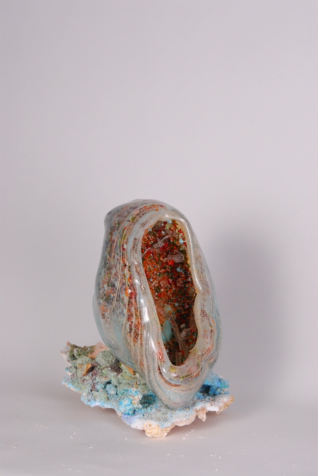 GROWING MY NATURAL FORMATIONS: A sandscape erupts into a silica vessel that oozes ceramic glazes which fuse, melt, and crystallize. In the center, hot rocks fume under a glass lake and release salt gases that cause the liquid surface to swell into a sparkling dome. The finished work is a fossilized imprint of many processes that contains a living dimension.